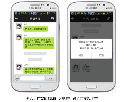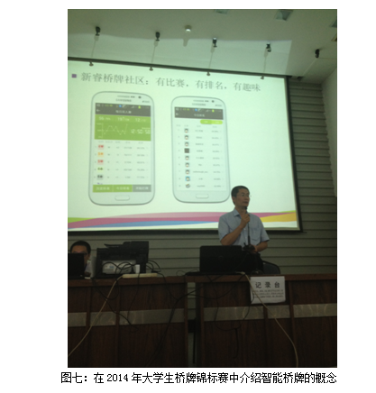 以智能桥牌为基础,通过移动互联网技术构建的社区称为智能桥牌社区。在智能桥牌社区中,桥牌爱好者在叫牌的时候,系统会提示每个叫品的含义。有了叫品提示,学生们可以在打牌的过程中,通过查询叫品的含义,选择合适的叫品进行叫牌。实践证明,很多学生在这个过程中潜移默化地掌握了一个叫牌系统。